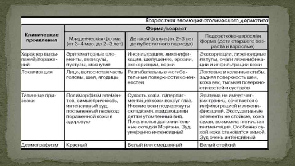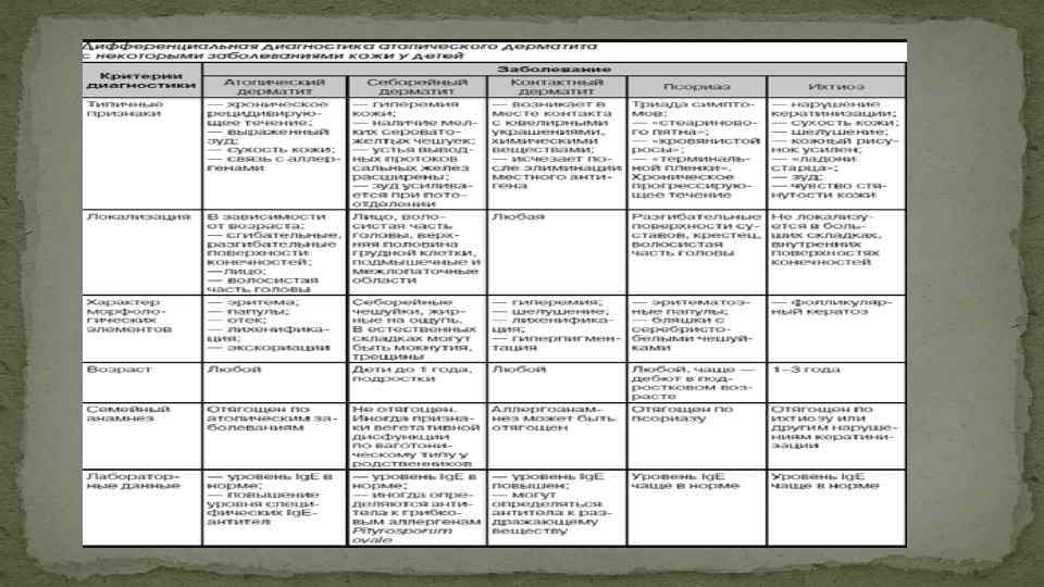 Диагностика критерилері Шағымдар мен анамнез: - тері қышымасы; - ерте басталу (2 жасқа дейін); - тері қатпарының зақымдануы, сонымен бірге, 10 жастан кіші балалар ұртының анамнездік көрсеткіші; - анамнездегі терінің жалпы құрғауы; - анамнездегі аллергиялық ринит немесе бронхиалды астма, сонымен бірге жақын туыстарындағы (1 дәрежелі туыстығы) 4 жасқа дейінгі кез келген атопиялық ауырулары. Физикалық тексеру: терінің қатпарлық зақымдану мінезі, лихенизация. Инструменталдық зерттеулер: асқазан-ішек жолдарының функционалдық және органикалық патологияларын анықтау – құрсақ қуысы ағзаларын УДЗ Лабораторлық зерттеулер: Іg Е сарысуының жоғарлау деңгейі, Іg Е – ИФА диагностикасын арнайы анықтау.