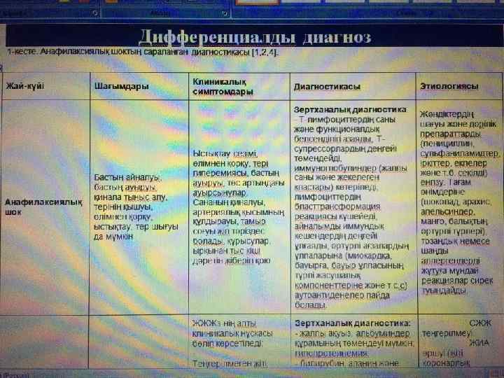 Диагностикасы Анамнез: Бұрын аллергиялық реакция болған ба? Егер болса, онда аллергияны не шақырды және қалай пайда болды? Қандай дәрілер қабылдады (антигитаминдер, глюкокортикостероидтар, адреналин)? Бұл жолы аллергияның пайда болуына не себеп болды (тағамдар, қалыпты рационға кірмейтіндер, дәрі қабылдау, жәндіктер шағу)? Өз бетінше не қабылдады және әсері болды ма? Артериальды қан қысымын өлшеу Жалпы қан талдауы • Барлық көрсеткіштер Биохимиялық қан талдауы Жіті жағдайды тоқтату кезеңінде ЭКГ-мониторинг, артериялық қысымды, ЖЖЖ, дене қызуын, несеп шығаруды бақылауды, пульсоксиметрия жүргізеді [2]. Көрсеткіштер бойынша мыналарды анықтайды ·