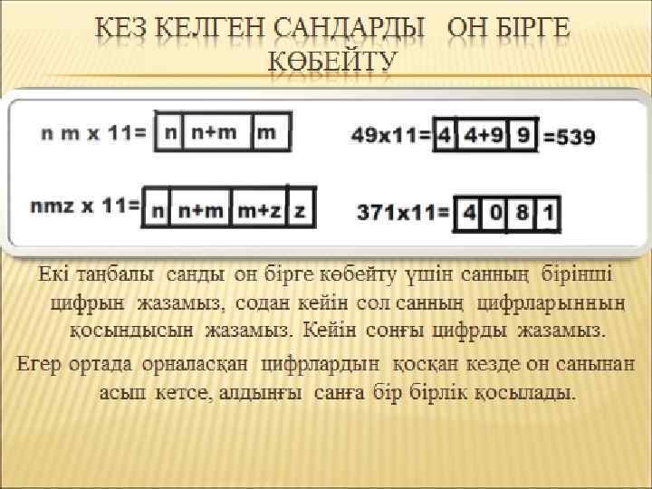 40 -50 АРЛЫҒЫНДАҒЫ САНДАРДЫ КВАДРАТТАУ 4 n²=100 x(25 -(50 -4 n))+(10 -n)² 48²=100 x(25 -(50 -48))+(10 -8)²=2304 40 -50 аралығындағы сандарды квадраттау үшін, елуден қырық n санын аламыз, шыққан санды жиырма бестен аламыз да , жүзге көбейтеміз. Нәтижесін есте сақтаймыз. Оннан n санын аламыз, шыққан санды квадраттап, есте сақтаған санға қосамыз.