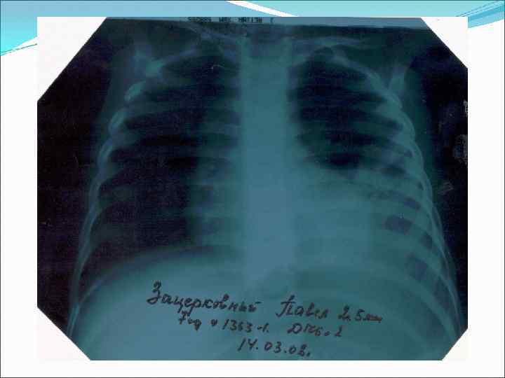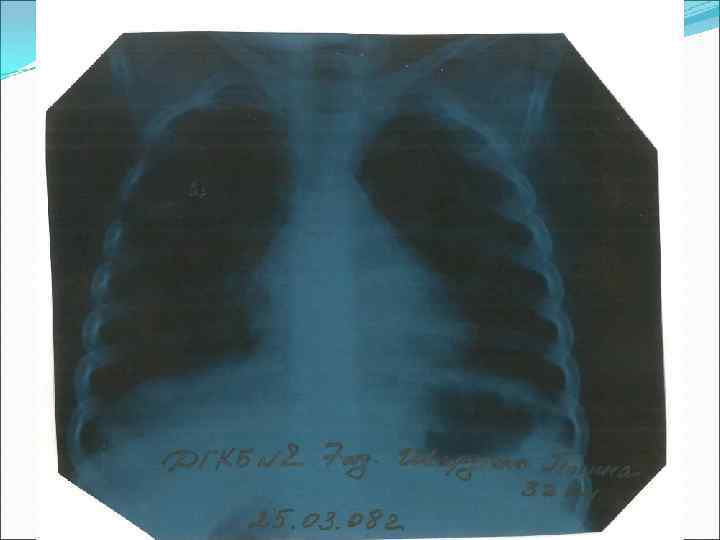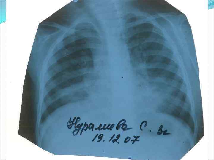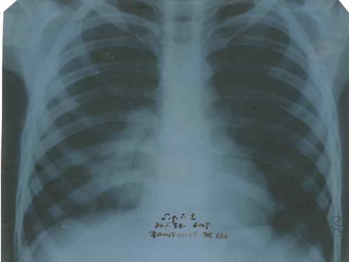 Синпневмониялық плеврит Экссудативті плеврит Этиологиясы – пневмококты, сирек гемофилюсты Пневмониямен қатар, бір уақытта басталады Нозокомиальды плеврит стафилококты, көкірінді Гипертермия, токсикоз Ауыру сезімі, терең дем алу қиындайды. Жөтел қысқа, ауыру сезіммен Ентігу. Ыңқылдаған тыныс Плевраның үйкеліс шуы, экссудат жиналғанда, ентігу күшейеді Дыбыс тұйық, тыныс әлсірейді, кейде естілмейді