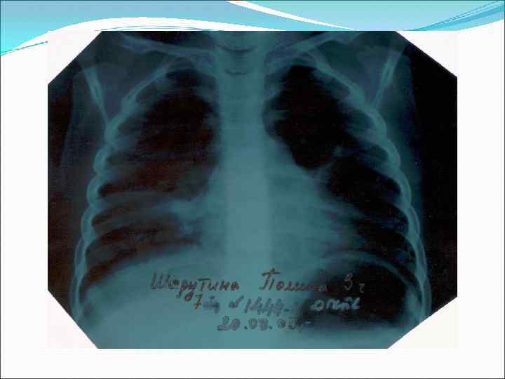 Жөтел - қысқа, ауыру сезіммен Айқын токсикоз – қозғыштық, кейін енжарлық, терінің бозаруы, тәбеттің жоқ болуы Ентігу (беткейлі тыныс, тахипноэ) тыныштықта Периоральды цианоз Перкуссия – бірінші күнде дыбыс тимпаникалық реңмен, кейін зақымдалған бөліктің тұсында – дыбыстың тұйықталуы