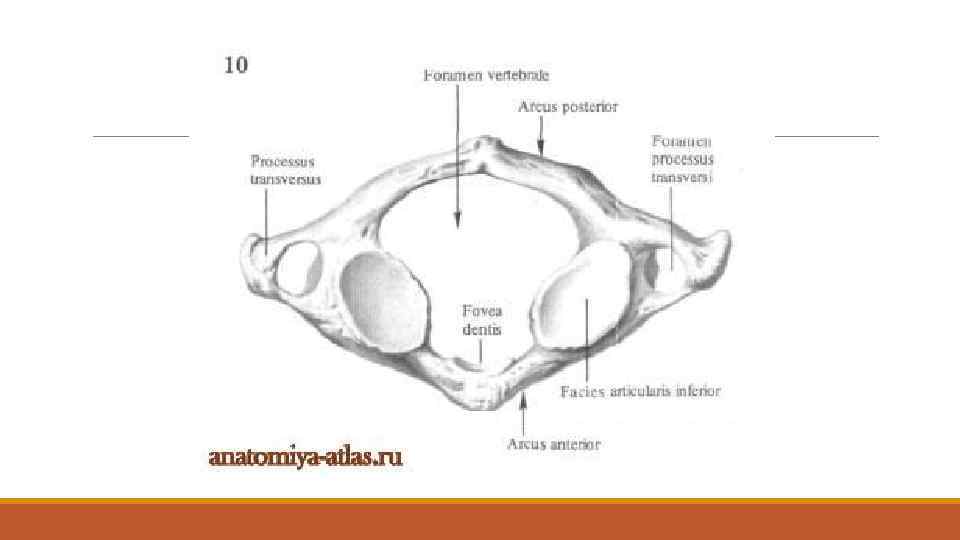 I мойын омыртқа I мойын омыртқа, ауыз омыртқа немесе атлант, atlantseu atlas, бассүйекпен буын арқылы тікелей байланысуына және оған түсетін салмақтың көлеміне байланысты, сыртқы пішіні өзгеше болып келген. Бұл омыртқа: алдыңғы, артқы доғасынан және жұп бүйір бөліктерінен тұрады. Алдыңғы доғасы, arcus anterior, ол бірінші мойын омыртқа денесінің эмбрионалдық даму кезіндегі қалдығы болып саналады. Алдыңғы доғаның аддыңғы беті дөңестеу болып келуімен қатар, мұнда алдыңғы доғаның төмпешігі, tuberculum anterius, орналасқан. Алдыңғы доғаның артқы омыртқа тесігіне қараған беті ойыстау болып келген, мұнда екінші мойын омыртқаның тістәрізді өсіндісімен беттесіп, буын құрайтын тіс шұңқырсы, fovea dentis, орналасқан.