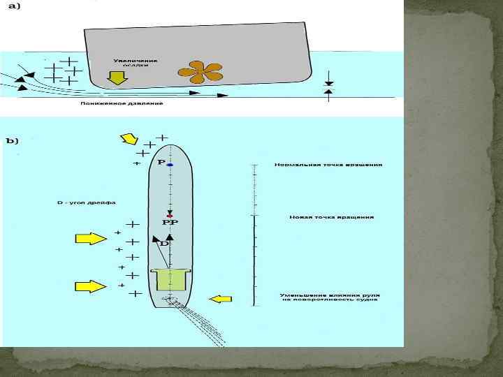 Вращающий момент, создаваемый пером руля, при всех прочих равных условиях зависит от скорости набегающего потока. Увеличение скорости попутного потока при выходе судна на мелководье снижает скорость набегающего на перо руля потока и, как следствие, снижает эффективность рулевого устройства. Другим фактором, влияющим на управляемость, является то, что при выходе судна на мелководье для сохранения прежней скорости требуются большие энергетические затраты, чем на глубокой воде. Эта дополнительная энергия расходуется на то, что в процесс волнообразования вовлекаются дополнительные массы воды. Таким образом происходит увеличение кинетической энергии движущейся вместе с судном воды, а следовательно, и кинетической энергии системы “судно плюс присоединенные массы воды”. Увеличение инерционности судна при падении эффективности пера руля приводит к ухудшению маневренных и тормозных характеристик судна.