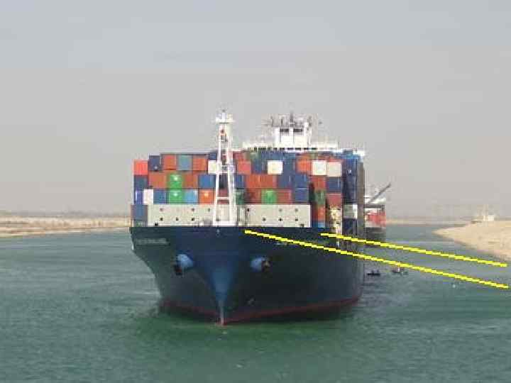 ПРОСАДКА СУДНА ПРИ ПЛАВАНИИ НА МЕЛКОВОДЬЕ (СКОРОСТНОЕ ПРОСЕДАНИЕ) Образование одиночной поперечной волны понижает уровень поверхности воды у бортов судна, что вызывает опускание корпуса относительно уровня спокойной воды и увеличение дифферента. Это явление называется просадкой. Для большинства судов, имеющих обычную конфигурацию корпуса (без носового бульба), характерно проседание с дифферентом на корму. Скоростное проседание с дифферентом на нос характерно для крупнотоннажных судов. Результаты натурных испытаний показывают, что у судов с коэффициентом общей полноты Св ≥ 0. 8 проседание носовой оконечностью больше, чем кормовой. При движении судна околокритическими скоростями просадка может достигать 5 -7% от средней осадки. На малых глубинах величина просадки еще более увеличивается из-за присасывания корпуса судна к грунту.
