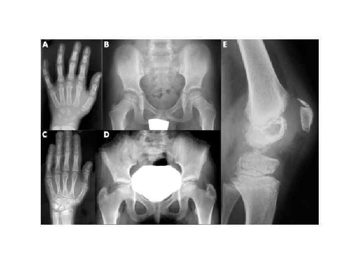 Ядроның сүйектенуінің ақауы • Бұл эпифиздің ядроларының сүйектенуінің баяу, дұрыс емес, бұрмаланып дамуы. Ауру ерте балалық шақта көрініс табады. Науқастар бойы аласа, аяқтары қысқарған және аяқ қолдар буындарының контрактурасы. • Рентгендегі көрінісі: • Сүйектену ядроларының кеш пайда болуы, олардың баяу дұрыс емес дамуы болады.