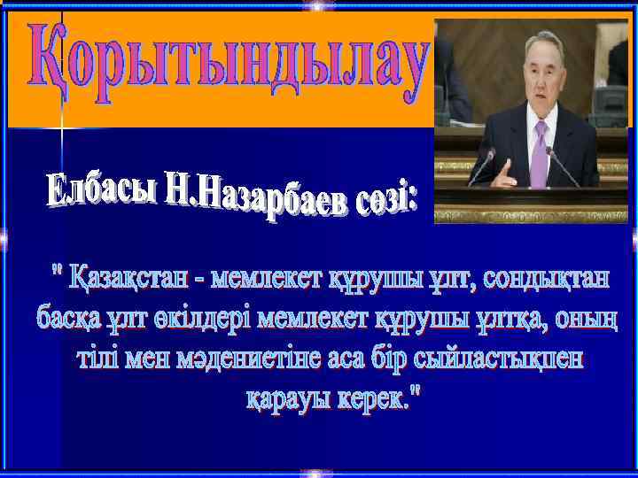 Тәуелсіздігінің 22 -ші жылына аттаған елдің бүгінгі бар жеткені бір ғана бірліктің арқасында. мемлекеттің әл-ауқаты артып, елдің тұрмысы түзелді. Аяғымыздан енді тұрып жатқан кешегі елең-алаң заманда ынтымақ пен татулығымыз болмағанда, жұрт болып жұмылып, ел болып еңсе көтерудің өзі неғайбыл еді. Осы бірлік пен түсіністіктің арқасында небәрі 22 жылдың ішінде тәуелсіз ел құрдық. Қазақстанымызды бүкіл дүние жүзіне әйгілі халық, әйгілі мемлекет жасадық. Экономикамыз көтерілді. Халықтың әл-ауқаты жақсарды. «Шығыстың барыстары» деп жүретін мемлекеттердің қатарына қосылды. Елдегі татулықтың берік тірегіне айналған мызғымас институт Қазақстан Халқы Ассамблеясы табысты жұмыс істеп келеді. Тілі басқа болса да тілегі, жүзі басқа болса да жүрегі бір жүз отыздан аса ұлт пен ұлыс үшін бір ғана мүдде –достық болса, олардың ортақ арманын бір ғана Отан орындайды. Ол Қазақстан
