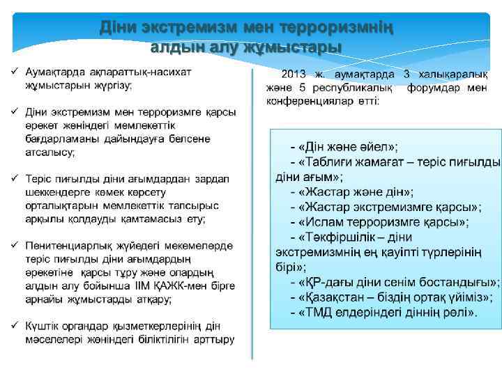 Дүниетаным жүйесі мен өмір салты ретіндегі діннің рөлі Бүгінгі таңда түрлі конфессиялар өкілдерінің бейбіт қатар өмір сүруі және өзара тиімді қарым-қатынас жасауы үшін елімізде қолайлы жағдайлар жасалған. Сонымен қатар, Қазақстандағы конфессияаралық қатынастар басқа елдер үшін үлгі болып табылады. Алайда, кейбір дінге сенушілер агрессия мен діни радикализмнің қауіпті формаларына бой алдырып, азаматтардың қауіпсіздігі мен мемлекеттің тұрақтылығына қауіп төндіруде
