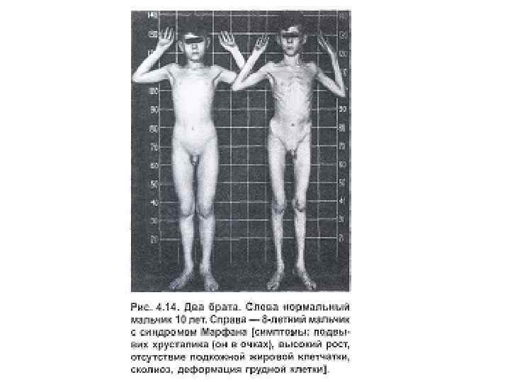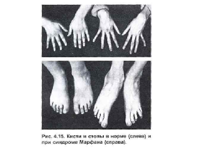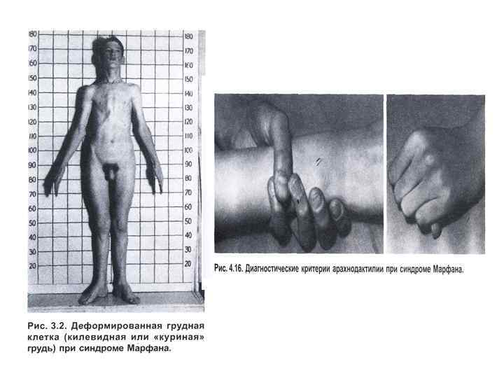 Марфан синдромы - дәнекерлеуші ұлпа ауруы (фибрилин генінде мутация). Клиникалық көріністер: 1. Арахнодактилия, бойы ұзын, аяқтары ұзын, омыртқа деформациясы (сколиеоз), шығыңқы «тауық көкіректі» , май табан және бұлшық ет гипотониясы. 2. Көз бұршағы өзгерген, миопия (близорукость), көздің торлы қабығының бөлінуі. 3. Жүрек жұмысының бұзылысы, шап жарығы (паховая грыжа).