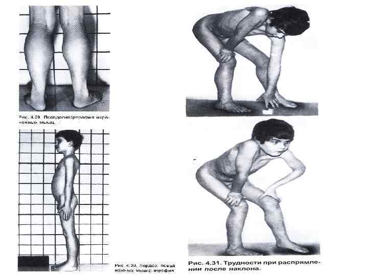 Бұлшық ет дистрофиясы немесе миопатия Дюшенна Х-тіркес рецессивті ауру, ұл балаларда кездеседі (1 -5 жаста). Клиникалық көріністері: жиі құлау, «үйрек жүрісті» , аяқтың Балтыр ет гипертрофиясы, соңынан сан бұлшық етінің, қол иық және жамбас белдерінің атрофиясы, интеллектің төмендеуі.
