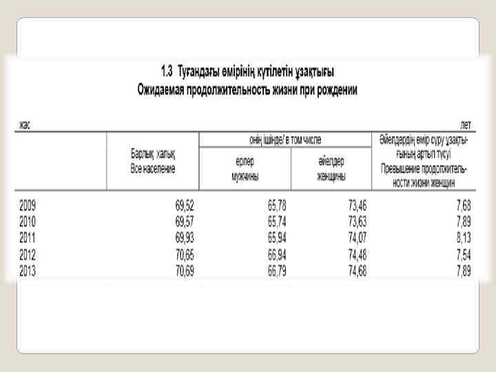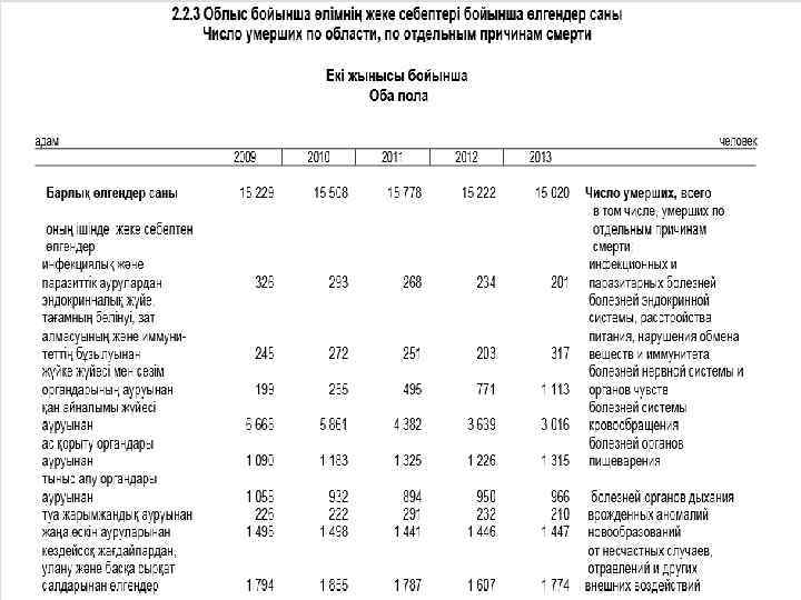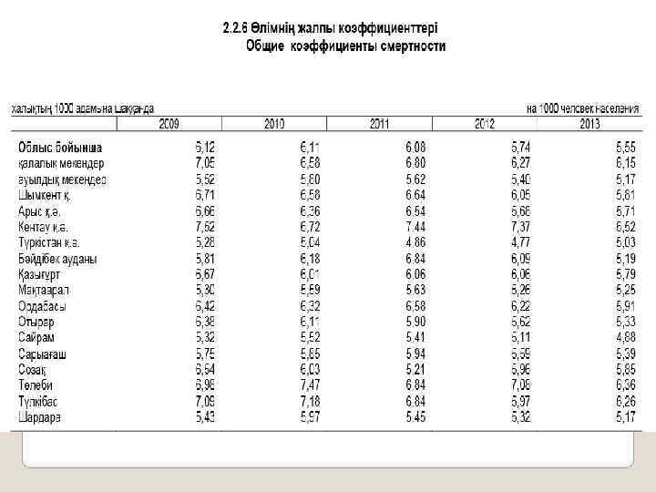 Саламатты Қазақстан мемлекеттік бағдарламасының нысаналы индикаторлардың орындалуы: ü Ана өлімінің көрсеткіші 15, 2 құрап отыр, бұл көрсеткіш 2013 ж. 12, 8 құраған (жоспар – 12, 1). ü Нәресте өлімінің көрсеткіші 11, 3 құрап отыр, бұл көрсеткіш 2013 ж. 13, 2 құраған (жоспар – 12, 4). ü Жалпы өлім-жітім 1000 адамға шаққанда 5, 1 дейін төмендеді, бұл көрсеткіш 2013 ж. – 5, 5 құраған (жоспар – 5, 7). ü Қанайналым жүйесінің өлім-жітім көрсеткіші 100 мың адамға шаққанда 94, 8 дейін төмендеді, бұл көрсеткіш 2013 ж. -114, 7 құраған (жоспар – 153, 44).