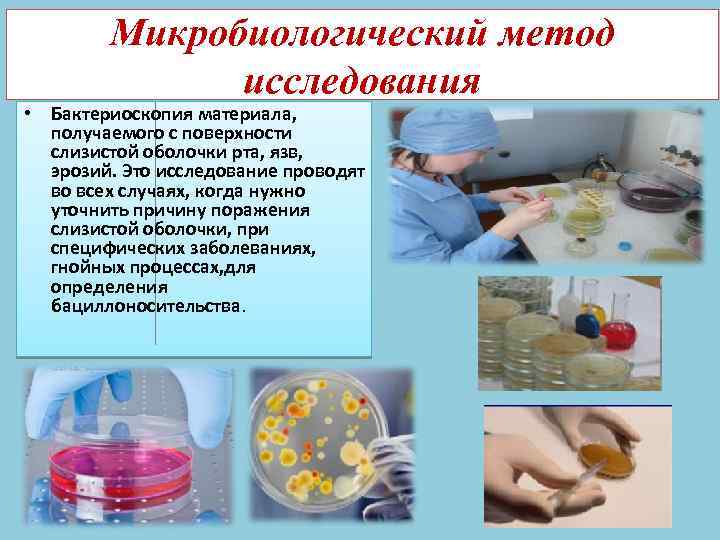 Микробиологический метод исследования • Бактериоскопия материала, получаемого с поверхности слизистой оболочки рта, язв, эрозий. Это исследование проводят во всех случаях, когда нужно уточнить причину поражения слизистой оболочки, при специфических заболеваниях, гнойных процессах, для определения бациллоносительства.