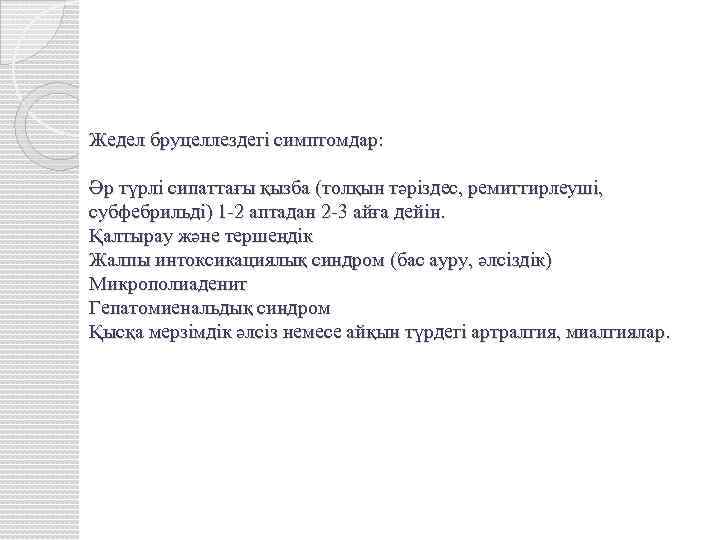 Жедел бруцеллездегі симптомдар: Әр түрлі сипаттағы қызба (толқын тәріздес, ремиттирлеуші, субфебрильді) 1 -2 аптадан 2 -3 айға дейін. Қалтырау және тершеңдік Жалпы интоксикациялық синдром (бас ауру, әлсіздік) Микрополиаденит Гепатомиенальдық синдром Қысқа мерзімдік әлсіз немесе айқын түрдегі артралгия, миалгиялар.