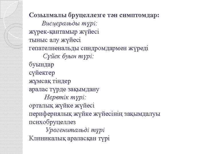 Созылмалы бруцеллезге тән симптомдар: Висцеральды түрі: жүрек-қантамыр жүйесі тыныс алу жүйесі гепателиенальды синдромдармен жүреді Сүйек буын түрі: буындар сүйектер жұмсақ тіндер аралас түрде зақымдану Нервтік түрі: орталық жүйке жүйесі перифериялық жүйке жүйесінің зақымдалуы психобруцеллез Урогенитальді түрі Клиникалық араласқан түрі