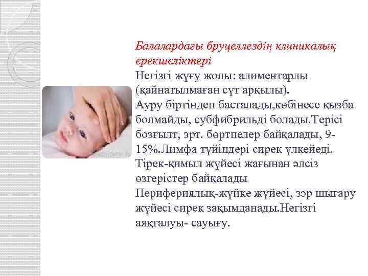 Балалардағы бруцеллездің клиникалық ерекшеліктері Негізгі жұғу жолы: алиментарлы (қайнатылмаған сүт арқылы). Ауру біртіндеп басталады, көбінесе қызба болмайды, субфибрильді болады. Терісі бозғылт, эрт. бөртпелер байқалады, 915%. Лимфа түйіндері сирек үлкейеді. Тірек-қимыл жүйесі жағынан әлсіз өзгерістер байқалады Перифериялық-жүйке жүйесі, зәр шығару жүйесі сирек зақымданады. Негізгі аяқталуы- сауығу.
