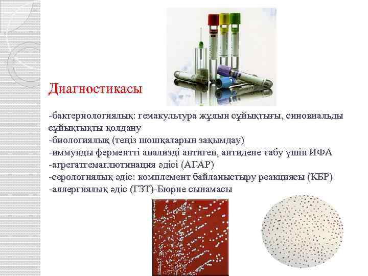 Диагностикасы -бактериологиялық: гемакультура жұлын сұйықтығы, синовиальды сұйықтықты қолдану -биологиялық (теңіз шошқаларын зақымдау) -иммунды ферментті анализді антиген, антидене табу үшін ИФА -агрегатгемаглютинация әдісі (АГАР) -серологиялық әдіс: комплемент байланыстыру реакциясы (КБР) -аллергиялық әдіс (ГЗТ)-Бюрне сынамасы