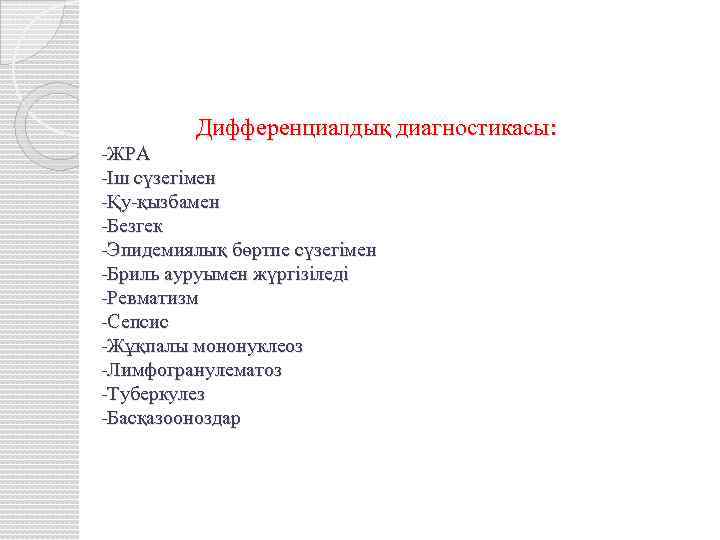 Дифференциалдық диагностикасы: -ЖРА -Іш сүзегімен -Қу-қызбамен -Безгек -Эпидемиялық бөртпе сүзегімен -Бриль ауруымен жүргізіледі -Ревматизм -Сепсис -Жұқпалы мононуклеоз -Лимфогранулематоз -Туберкулез -Басқазооноздар