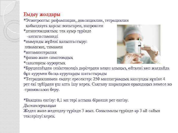 Емдеу жолдары *Этиотропты: рифампицин, доксициклин, тетрациклин қабылдауға қарсы: вольтарен, напроксен *дезинтокциялық: тек ауыр түрінде -антигистаминді *иммунды жүйені қалыптастыру: левамизол, тимамен *витаминтерапия *физио және симптомдық *санаторлы-курортық *Бруцеллёзден сезіктенсеңіз дәрігерден кеңес алыңыз, өйткені көп жағдайда бұл аурумен басқа ауруларды шатастырады *Тетрациклинмен емдеу: ересектер: 250 миллиграмдық капсулды күніне 4 рет екі түйірден үш апта ішу керек. Сақтану шараларын орындаңыз немесе ко -тримоксазол беру. *Вакцина енгізу: 0, 1 мл тері астына бірнеше рет енгізу. Диспансеризация Жедел және жеделдеу түрінде 3 жыл. Созылмалы түрінде әр 3 ай сайын тексерілуі керек.