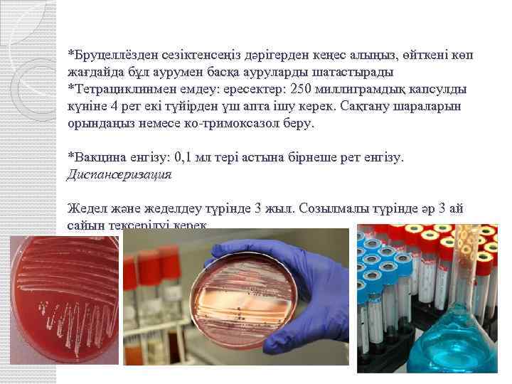 *Бруцеллёзден сезіктенсеңіз дәрігерден кеңес алыңыз, өйткені көп жағдайда бұл аурумен басқа ауруларды шатастырады *Тетрациклинмен емдеу: ересектер: 250 миллиграмдық капсулды күніне 4 рет екі түйірден үш апта ішу керек. Сақтану шараларын орындаңыз немесе ко-тримоксазол беру. *Вакцина енгізу: 0, 1 мл тері астына бірнеше рет енгізу. Диспансеризация Жедел және жеделдеу түрінде 3 жыл. Созылмалы түрінде әр 3 ай сайын тексерілуі керек.