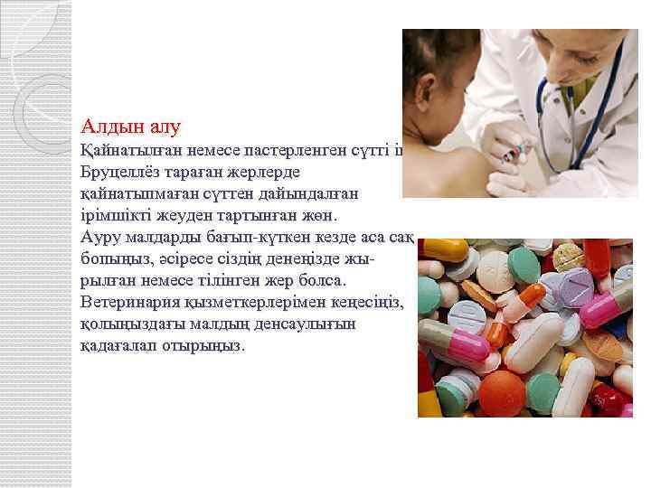 Алдын алу Қайнатылған немесе пастерленген сүтті ішу. Бруцеллёз тараған жерлерде қайнатыпмаған сүттен дайындалған ірімшікті жеуден тартынған жөн. Ауру малдарды бағып-күткен кезде аса сақ бопыңыз, әсіресе сіздің денеңізде жырылған немесе тілінген жер болса. Ветеринария қызметкерлерімен кеңесіңіз, қолыңыздағы малдың денсаулығын қадағалап отырыңыз.