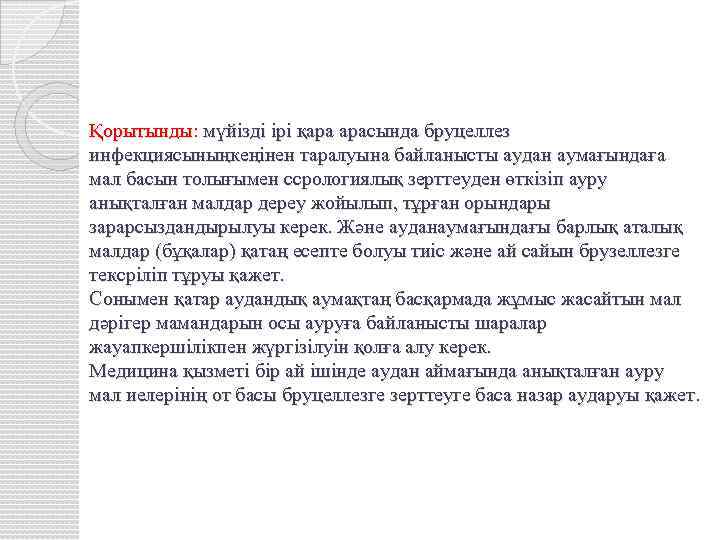 Қорытынды: мүйізді ірі қара арасында бруцеллез инфекциясыныңкеңінен таралуына байланысты аудан аумағындаға мал басын толығымен ссрологиялық зерттеуден өткізіп ауру анықталған малдар дереу жойылып, тұрған орындары зарарсыздандырылуы керек. Және ауданаумағындағы барлық аталық малдар (бұқалар) қатаң есепте болуы тиіс және ай сайын брузеллезге тексріліп тұруы қажет. Сонымен қатар аудандық аумақтаң басқармада жұмыс жасайтын мал дәрігер мамандарын осы ауруға байланысты шаралар жауапкершілікпен жүргізілуін қолға алу керек. Медицина қызметі бір ай ішінде аудан аймағында анықталған ауру мал иелерінің от басы бруцеллезге зерттеуге баса назар аударуы қажет.