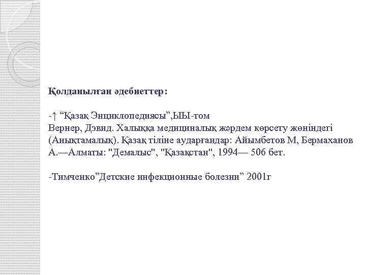 Қолданылған әдебиеттер: -↑ “Қазақ Энциклопедиясы”, ЫЫ-том Вернер, Дэвид. Халыққа медициналық жәрдем көрсету жөніндегі (Анықтамалық). Қазақ тіліне аударғандар: Айымбетов М, Бермаханов А. —Алматы: "Демалыс", "Қазақстан", 1994— 506 бет. -Тимченко”Детские инфекционные болезни” 2001 г