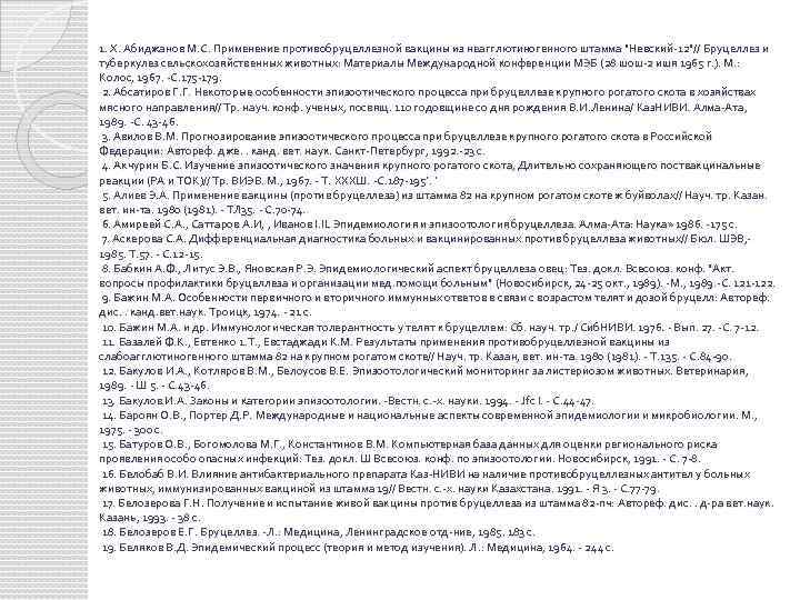 1. X. Абиджанов М. С. Применение противобруцеллезной вакцины из неагглютиногенного штамма "Невский-12"// Бруцеллез и туберкулез сельскохозяйственных животных: Материалы Международной конференции МЭБ (28 шош-2 ишя 1965 г. ). М. : Колос, 1967. -С. 175 -179. 2. Абсатиров Г. Г. Некоторые особенности эпизоотического процесса при бруцеллезе крупного рогатого скота в хозяйствах мясного направления// Тр. науч. конф. ученых, посвящ. 110 годовщине со дня рождения В. И. Ленина/ Каз. НИВИ. Алма-Ата, 1989. -С. 43 -46. 3. Авилов В. М. Прогнозирование эпизоотического процесса при бруцеллезе крупного рогатого скота в Российской Федерации: Автореф. дже. . канд. вет. наук. Санкт-Петербург, 1992. -23 с. 4. Акчурин Б. С. Изучение эпизоотического значения крупного рогатого скота, Длительно сохраняющего поствакцинальные реакции (РА и ТОК)// Тр. ВИЭВ. М. , 1967. - Т. ХХХШ. -С. 187 -195'. ' 5. Алиев Э. А. Применение вакцины (против бруцеллеза) из штамма 82 на крупном рогатом скоте ж буйволах// Науч. тр. Казан. вет. ин-та. 1980 (1981). - ТЛ 35. - С. 70 -74. 6. Амиреей С. А. , Саттаров А. И, , Иванов I. IL Эпидемиология и эпизоотология бруцеллеза. Алма-Ата: Наука» 1986. -175 с. 7. Аскерова С. А. Дифференциальная диагностика больных и вакцинированных против бруцеллеза животных// Бюл. ШЭВ, - 1985. Т. 57. - С. 12 -15. 8. Бабкин А. Ф. , Литус Э. В. , Яновская Р. Э. Эпидемиологический аспект бруцеллеза овец: Тез. докл. Всесоюз. конф. "Акт. вопросы профилактики бруцеллеза и организации мед. помощи больным" (Новосибирск, 24 -25 окт. , 1989). -М. , 1989. -С. 121 -122. 9. Бажин М. А. Особенности первичного и вторичного иммунных ответов в связи с возрастом телят и дозой бруцелл: Автореф. дис. . канд. вет. наук. Троицк, 1974. - 21 с. 10. Бажин М. А. и др. Иммунологическая толерантность у телят к бруцеллем: Сб. науч. тр. / Сиб. НИВИ. 1976. - Вып. 27. -С. 7 -12. 11. Базалей Ф. К. , Евтенко 1. Т. , Евстаджади К. М. Результаты применения противобруцеллезной вакцины из слабоагглютиногенного штамма 82 на крупном рогатом скоте// Науч. тр. Казан, вет. ин-та. 1980 (1981). - Т. 135. - С. 84 -90. 12. Бакулов И. А. , Котляров В. М. , Белоусов В. Е. Эпизоотологический мониторинг за листериозом животных. Ветеринария, 1989. - Ш 5. - С. 43 -46. 13. Бакулов И. А. Законы и категории эпизоотологии. -Вестн. с. -х. науки. 1994. - Jfc I. - С. 44 -47. 14. Бароян О. В. , Портер Д. Р. Международные и национальные аспекты современной эпидемиологии и микробиологии. М. , 1975. - 300 с. 15. Батуров О. В. , Богомолова М. Г. , Константинов В. М. Компьютерная база данных для оценки регионального риска проявления особо опасных инфекций: Тез. докл. Ш Всесоюз. конф. по эпизоотологии. Новосибирск, 1991. - С. 7 -8. 16. Белобаб В. И. Влияние антибактериального препарата Каз-НИВИ на наличие противобруцеллезных антител у больных животных, иммунизированных вакциной из штамма 19// Вестн. с. -х. науки Казахстана. 1991. - Я 3. - С. 77 -79. 17. Белозерова Г. Н. Получение и испытание живой вакцины против бруцеллеза из штамма 82 -пч: Автореф. дис. . д-ра вет. наук. Казань, 1993. - 38 с. 18. Белозеров Е. Г. Бруцеллез. -Л. : Медицина, Ленинградское отд-ние, 1985. 183 с. 19. Беляков В. Д. Эпидемический процесс (теория и метод изучения). Л. : Медицина, 1964. - 244 с.