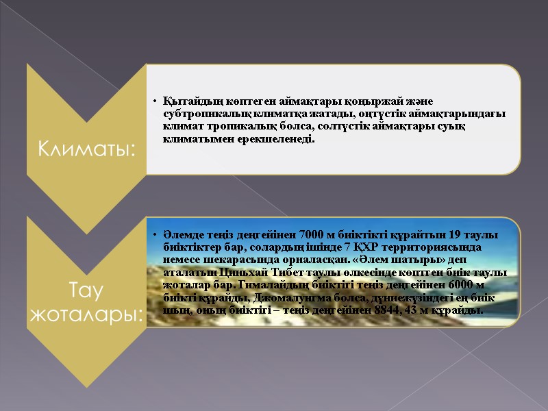 Жалпы шолу: Ресми тілі: қытай Астанасы: Пекин Ірі қалалары: Гуанчжоу, Шанхай Төрағасы: Ху Жинтау Жұрты • Сарап (2006) • Санақ (2000) • Тығыздығы 1,315,844,0004 адам (1-ші) 1,242,612,226 адам 140 адам/км² (72-ші (2)) ЖІӨ • Қорытынды (2010) • Жан басына шаққанда $ 9,872 трлн $ (2-ші) $7,368 $ (51)