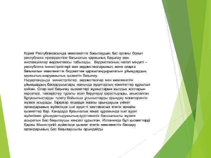 Шет елдегі қаржылық бақылау Барлық мемлекеттерде олардың құрылымындағы ерекшеліктеріне байланысты қаржылық бақылаудың өз жүйелері қалыптасқан. Шет елдердегі бақылау ревизиялық жүйені ұйымдастыру мен оның қызметі көп жылдық халықаралық тәжірибеге сүйенетін жалпы қағидаларға негізделеді. Барлық елдерде мемлекеттік қаржыны жұмсауға парламенттік бақылаудың арнайы институттары бар. Ресейде - Ресей Федерациясының шоттық палатасы, АҚШ-та Конгрестің басты бюджеттік бақылау басқармасы, Ұлыбританияда Ұлттық бақылау ревизиялық басқармасы, Канадада Бас ревизор ведомствосы, Францияда Шоттар соты, Швецияда Ұлттық ревизиялық бюро.