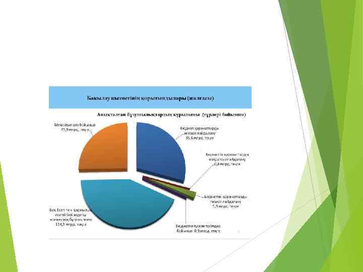 Қорытынды Қорыта айтқанда, қаржы жүйесін құрайтын жеке элементтердің орны мен рөлі бірдей емес. Бастапқы элемент жүйесінің басқа элементтерінің арасында алдыңғы орынды алады, өйткені жүйе элементтері мен буындардың өзара байланысындағы оның рөлі айқындаушы болып табылады. Бұл – бірінші кезекте мемлекеттік бюджетпен көрінетін мемлекеттің қаржысы. Мемлекеттің қаржысы – қоғамдық өнімнің құнын және ұлттық байлықтың бір бөлігін бөлу және қайта бөлу туралы, мемлекеттік пен оның шаруашылық субъектілерінің қарамағына қаржы ресурстарын қалыптастырумен және мемлекеттің қаржысы өзіне мемлекеттік бюджетті, мемлекеттік бюджеттен тыс қорлары, мемлекеттік кредитті кіріктіреді. Қаржылық бақылау – қаржы жүйесінің барлық буындарының ресурстарын жасау, бөлу және оларды пайдаланудың негізділігін тексеруге бағытталған айрықшалық қызмет.