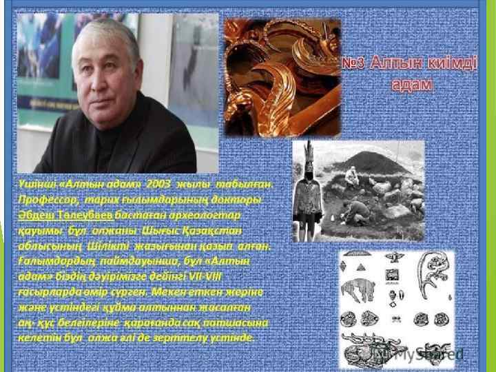 Жоспар: 1. Үшінші алтын адам табылған жер 2. Зерттеуші ғалымдардың айтуынша 3. Табылған бұйымдар 4. Қорытынды 5. Әдебиеттер