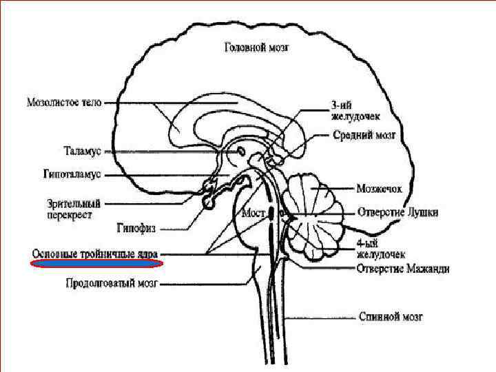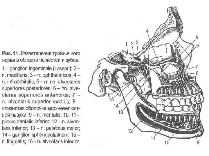 Үшкіл нервтің жүру жолдары мен ядролары 1 – көз жүйкесі; 2 – жоғарғы жақсүйек жүйкесі; 3 – төменгі жақсүйек жүйкесі; 4 – үшкіл түйін; 5 – үшкіл нервтің қозғалтқыш ядросы; 6 – үшкіл нервтің жоғарғы сезімтал ядросы; 7 - үшкіл нервтің жұлындық ядросы; 8 – бульботаламикалық жол; 9 - таламус; 10 – таламикоқыртыстық жол; 11 - қыртыс-ядролық жол.