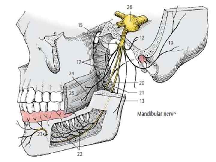 Үшкіл нерв, nervus trigeminus, 3 тармаққа бөлінеді: ØКөз жүйкесі, n. ophtalmicus ØЖоғарғы жақ жүйкесі, n. maxillaris ØТөменгі жақ жүйкесі, n. mandibularis