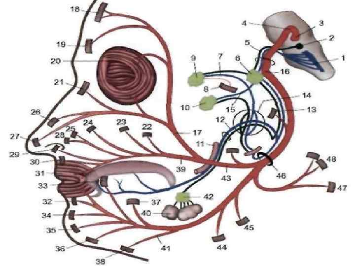 Лицевой (VII) нерв. 1 — ядро одиночного пучка; 2 — верхнее слюноотделительное ядро; 3 — ядро лицевого нерва; 4 — коленце (внутреннее) лицевого нерва; 5 — промежуточный нерв; 6 — узел ко ленца; 7 — глубокий каменистый нерв; 8 — внутренняя сонная артерия; 9 — крылонсб ный узел; 10 — ушной узел; II — язычный нерв; 12 — барабанная струна; 13 — стре менной нерв и стременная мышца; 14 — барабанное сплетение; 15 — коленцеобразный нерв; 16 — колено (наружное) лицевого нерва; 17 — височные ветви; 18 — лобное брюш ко затылочно лобной мышцы; 19 — мышца, сморщивающая бровь; 20 — круговая мыш ца глаз; 21 — мышца гордецов; 22 — большая скуловая мышца; 23 — малая скуловая мышца, 24 — мышца, поднимающая верхнюю губу; 25 — мышца, поднимающая верх нюю губу и крыло носа; 26, 27 — носовая мышца; 28 — мышца, поднимающая угол рта; 29 — мышца, опускающая перегородку носа; 30 — верхняя резцовая мышца; 31 — кру говая мышца рта; 32 — нижняя резцовая мышца; 33 — щечная мышца; 34 — мышца, опускающая нижнюю губу; 35 — подбородочная мышца; 36 — мышца, опускающая угол рта; 37 — мышца смеха; 38 — подкожная мышца шеи; 39 — скуловые ветви; 40 — подъ язычная железа; 41 — шейная ветвь; 42 — поднижнечелюстной узел; 43 — задний ушной нерв; 44 — ш ил оподъя зычная мышца; 45 — заднее брюшко двубрюшной мышцы; 46 — шилососцевидное отверстие; 47 — затылочное брюшко затылочно лобной мышцы. Крас ным цветом обозначены двигательные нервы, синим — чувствительные, зеленым — па расимпатические.