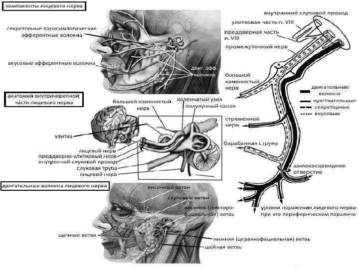 Лицевой нерв и составля ющие его нервные волокна, вариан ты их поражения при повреждении на разных уровнях. а — в области мостомозжечкового угла; б, в, г — уровни повреждения в канале лицевого нерва; д — повреж дение лицевого нерва после выхо да из шилососцевидного отверстия; 1 — внутренний слуховой проход; 2, 3 — улитковая и преддверная части преддверно улиткового (VIII) нерва; 4 — промежуточный (XIII) черепной нерв, или задний корешок лицево го нерва; 5 — секреторные волокна к слюнным железам; 6 — секретор ные волокна к слюнным железам; 7 — большой каменистый нерв; 8 — стремянный нерв; 9 — барабанная струна; 10 — шилососцевидное от верстие.
