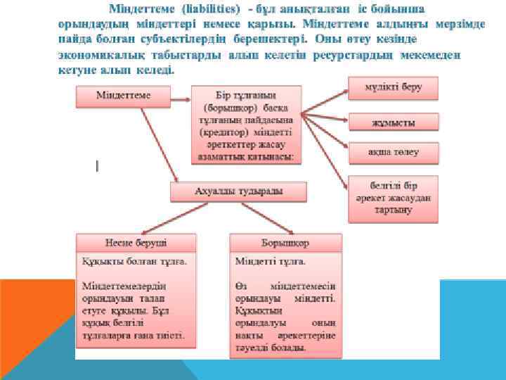 ҚОРЫТЫНДЫ: • Кәсіпорын қаржылық – шаруашылық қызметті жүргізу кезінде қызқа мерзімді міндеттемелері пайда болады. Себебі, бюджетпен, банктік ұйымдармен есеп айырысу, жабдықтаушылар мен мердігерлермен есеп айырысу, жұмысшылар мен қызыметкерлерге еңбекақы төлеу сияқты міндеттемелері туындайды. • Қысқа мерзімді міндеттемелерге 12 айдың ішінде өтелуі тиіс кредиторлық берешектер жатады. • Ағымдағы міндеттемелерді ашып көрсеткен кезде, кредиторлардың талабы бойынша төленуге тиісті міндеттемелер мен есепті күннен кейінгі бір жылдың ішінде өтелуге тиісті қыскқа мерзімді міндеттемелердің бөлігін қоса алғанда, мынадай баптар ашылуы тиіс: қысқа мерзімді несиелер; салықтар бойынша берешек; төлеуге арналған дивиденттер; жұмысшылар мен қызыметкерлерге еңбекақы төлеу; жабдықтаушылармен және мердігерлермен есеп айырысу.