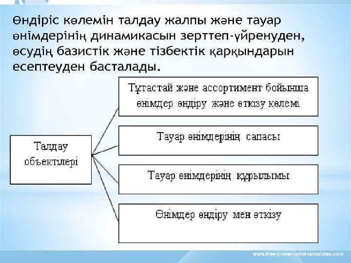 • Өндіріс процесінде қолданылатын шығындарды азайту. Өндіріс процесінде қолданылатын шығындардың мөлшерін азайту үшін үнемі экономикалық талдау жасау қажеттілігі туындайды. • Өнімнің өзіндік құнын азатуды қамтамасыз ететін жалпы факторларға мыналар жатады: – – – – Шикізат, материал, электроэнергия және жанармайды экономдау; өндірістің негізгі құралдарын қолдануды жақсарту; ресурс-үнемдеуші жаңа технологияларды қолдану; өнімді өткізу бойынша шығындарды азайту; кәсіпорынның тауар саясатын қайта қарастыру; жұмысын тоқтату және ақаулардан жоғалтуларды азайту; сатып алынатын материалдардың оптимальды көлемін және өндіріс процесінде өндірілетін өнім көлемінің дұрыстығын қадағалау және бақылау; – жалпы заводтық (жалпы шаруашылық) және цехтық шығындарды азайту;
