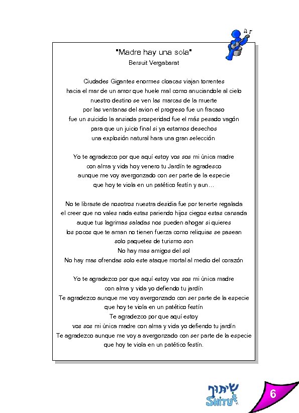 "Madre hay una sola" Bersuit Vergabarat Ciudades Gigantes enormes cloacas viajan torrentes hacia el mar de un amor que huele mal como anuciandole al cielo nuestro destino se ven las marcas de la muerte por las ventanas del avion el progreso fue un fracaso fue un suicidio la ansiada prosperidad fue el más pesado vagón para que un juicio final si ya estamos desechos una explosión natural hara una gran selección Yo te agradezco por que aquí estoy vos sos mi única madre con alma y vida hoy venero tu Jardín te agradesco aunque me voy avergonzado con ser parte de la especie que hoy te viola en un patético festín y aun… No te libraste de nosotros nuestra desidia fue por tenerte regalada el creer que no vales nada estas pariendo hijos ciegos estas cansada auque tus lagrimas saladas nos pueden ahogar si quieres los pocos que te aman no tienen fuerza como reliquias se pasean solo paquetes de turismo son No hay mas amigos del sol No hay mas ofrendas solo este ataque mortal al medio del corazón Yo te agradezco por que aquí estoy vos sos mi única madre con alma y vida yo defiendo tu jardín Te agradezco aunque me voy avergonzado con ser parte de la especie que hoy te viola en un patético festín Te agradezco por que aquí estoy vos sos mi única madre con alma y vida yo defiendo tu jardín Te agradezco aunque me voy a avergonzado con ser parte de la especie que hoy te viola en un patético festín. 6
