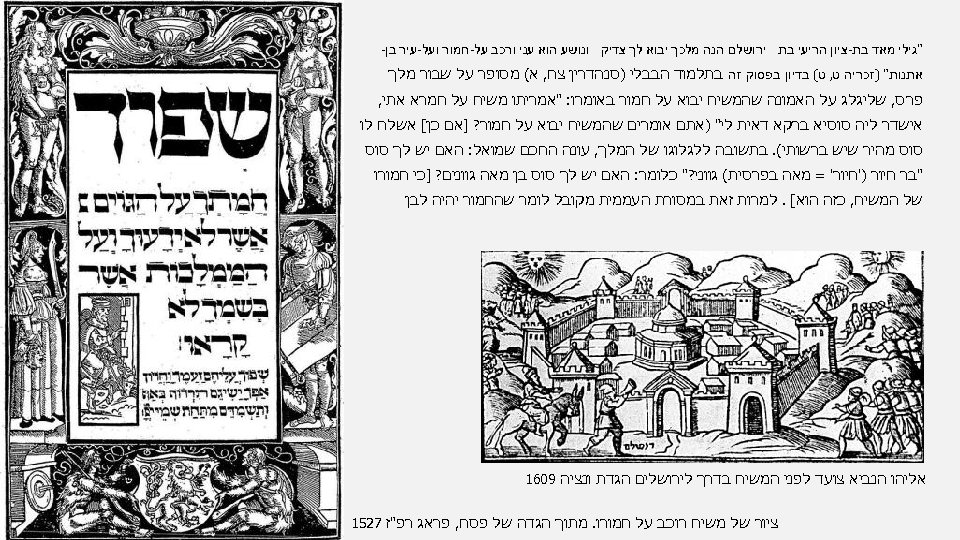 "גילי מאד בת-ציון הריעי בת ירושלם הנה מלכך יבוא לך צדיק ונושע הוא עני ורכב על-חמור ועל-עיר בן- אתנות" )זכריה ט, ט( בדיון בפסוק זה בתלמוד הבבלי )סנהדרין צח, א( מסופר על שבור מלך פרס, שליגלג על האמונה שהמשיח יבוא על חמור באומרו: "אמריתו משיח על חמרא אתי, אישדר ליה סוסיא ברקא דאית לי" )אתם אומרים שהמשיח יבוא על חמור? ]אם כן[ אשלח לו סוס מהיר שיש ברשותי(. בתשובה ללגלוגו של המלך, עונה החכם שמואל: האם יש לך סוס "בר חיור )'חיור' = מאה בפרסית( גווני? " כלומר: האם יש לך סוס בן מאה גוונים? ]כי חמורו של המשיח, כזה הוא[. למרות זאת במסורת העממית מקובל לומר שהחמור יהיה לבן אליהו הנביא צועד לפני המשיח בדרך לירושלים הגדת ונציה 9061 ציור של משיח רוכב על חמורו. מתוך הגדה של פסח, פראג רפ"ז 7251