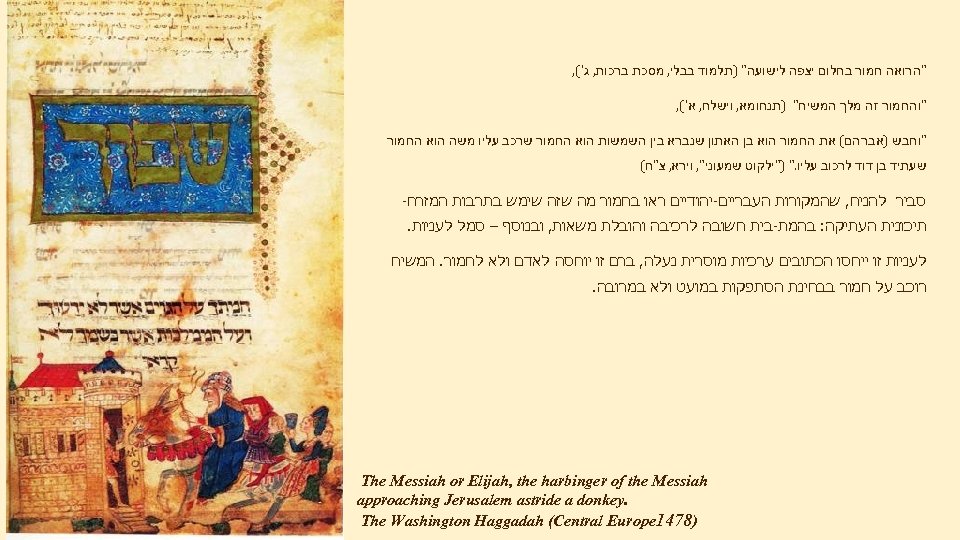 "הרואה חמור בחלום יצפה לישועה" )תלמוד בבלי, מסכת ברכות, ג'(, "והחמור זה מלך המשיח" )תנחומא, וישלח, א'(, "וחבש )אברהם( את החמור הוא בן האתון שנברא בין השמשות הוא החמור שרכב עליו משה הוא החמור שעתיד בן דוד לרכוב עליו. " )"ילקוט שמעוני", וירא, צ"ח( סביר להניח, שהמקורות העבריים-יהודיים ראו בחמור מה שזה שימש בתרבות המזרח- תיכונית העתיקה: בהמת-בית חשובה לרכיבה והובלת משאות, ובנוסף – סמל לעניות זו ייחסו הכתובים ערכיות מוסרית נעלה, ברם זו יוחסה לאדם ולא לחמור. המשיח רוכב על חמור בבחינת הסתפקות במועט ולא במרובה. The Messiah or Elijah, the harbinger of the Messiah . approaching Jerusalem astride a donkey )8741 The Washington Haggadah (Central Europe