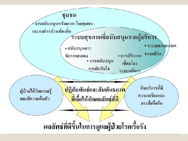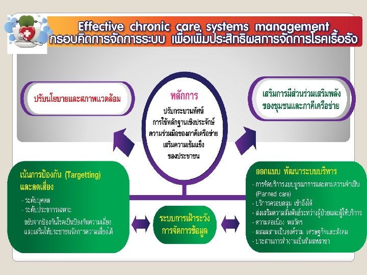 การจดการทงกลมปร ะชากร การจดการรายกล ม การจดการรา กรอบแนวคด รปแบบการดแลผปวยโรคเรอร ยบคคล เพมคณภาพชวต งเเบบ ลดวถชวตเสยง ลดการเกดโรค ลดการเขาอยใน รพ. ลดความพการ บรณาการ ประชากรทงหมด ความเสยงตำ ความเสยงสง มสญญาณผดปกต เปนโรค สรางเสรมสขภาพ วถชวตในสงแวดลอม มอาการ มสภาวะแทรกซอน ปองกนการเกดโรค ปองกนและชลอการดำเนนโรค ในกลมเสยงสง สภาวะแทรกซอนและการเปนซำ ปองกนการเพมขน ของประชากรทมปจจยเสยง พการ ลดความรนแรงของ ภาวะแทรกซอน