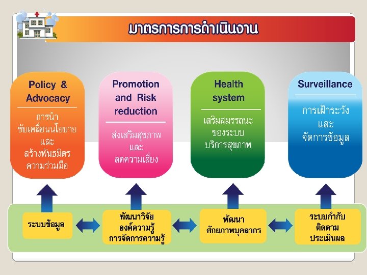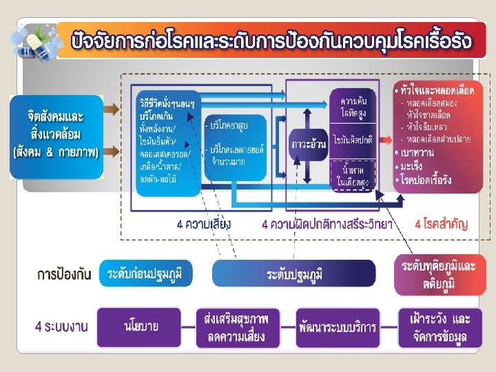สรป เปาหมาย และประเดนทตองการพฒนา ในชวงเวลาทชดเจน การดำเนนการ ในดาน นโยบาย และการปองกน ◦ การหาแนวรวม และสรางเครอขายกบกลมทเกยวของ ◦ การคนหาประเดนสำคญ เพอการทำงานรวมกน การพฒนาบรการดแล ใหมประสทธผล ประสทธภาพมากขน ◦ คนหาประเดน รปแบบทเกดผลไดด แลวใหขยายผล ◦ หาประเดนทเปนจดออน และคนหาสาเหต ปจจย ทเกยวของ ◦ การคดกรอง ปรบ ใหเปนเพมศกยภาพใหประชาชน แนวทางการควบคม ปองกน การดำเนนการรวมกบชมชน อยางเปนเจาของรวมกน NCDs และแนวรวม ◦ คนหาทน ◦ จดกระบวนการ เพอลงไปสนบสนน หนวยทเกยวของ หรอชมชน จดการไดเอง