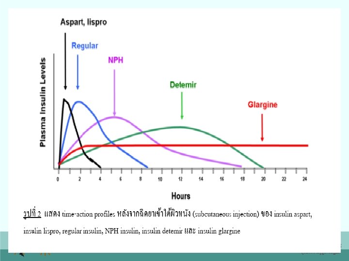 รปแบบการใหบรหารอนซลน ใน ผปวยเบาหวาน type 2 • Basal insulin รกษาระดบกลโคสใหคงท – ให NPH หรอ Lante เชาและกอนนอน – Continuous subcutaneous insulin infusion (CSII) – Insulin gargline วนละ 1 -2 ครง • Prandial insulin หลงออกมาเพอนำกลโคสเขาไปในเซลล + ยบยงการปลดปลอยกลโคสจากตบ – Insulin aspart, insulin lispro หรอ regular insulin กอนอาหารทกมอ • Correction-dose insulin