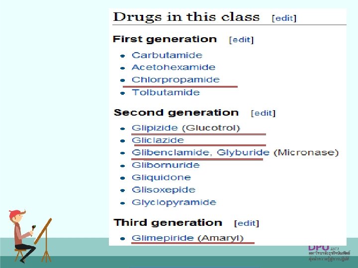 ยาลดระดบนำตาลในเลอด (Antihyperglycemic Drug) • • Sulfonylurea ---glipizide, glibenclamide Rapid acting insulin secretagogue--repaglitanide Biguanides --metformin Thiazolidinediones----Pioglitazone (Actos) Alpha-glucosidase inhibitor---Acarbose DPP-4 inhibitors---sitagliptin (Januvia) SGLT 2 inhibitors---Canagliptin Insulin