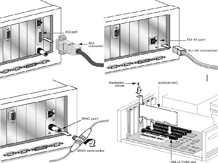 การดเครอขาย (Network Interface Cards : NIC( l Ethernet Card มความเรวทแตกตางกน ขนอยกบความเหมาะสม l Connector ทใชเพอเชอมกบสายสอสาร เชน คอนเนกเตอรแบบ RJ 45 เปนมาตรฐานของเครอขายอเทอรเนตใ นปจจบน , คอนเนกเตอรแบบ BNC หรอ EUI เปนการดรนเกา แตกยงใชกนอยบาง
