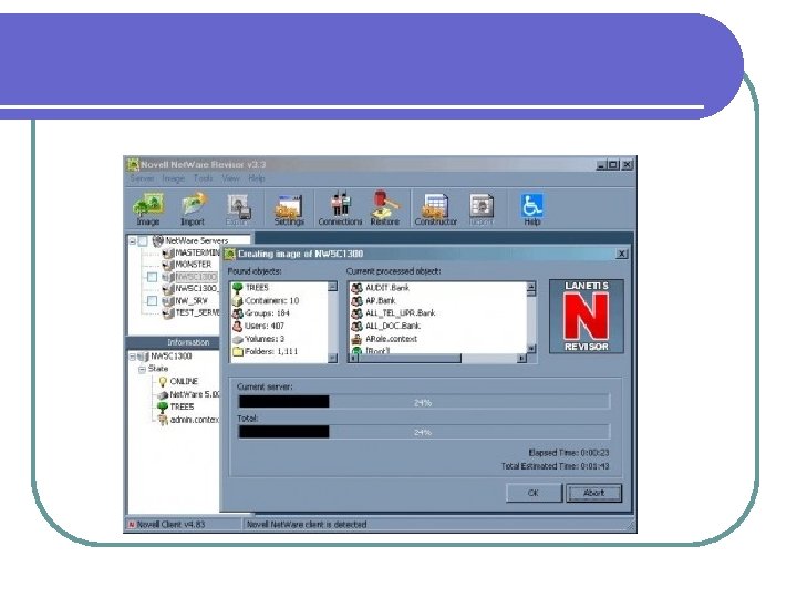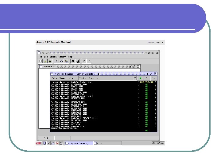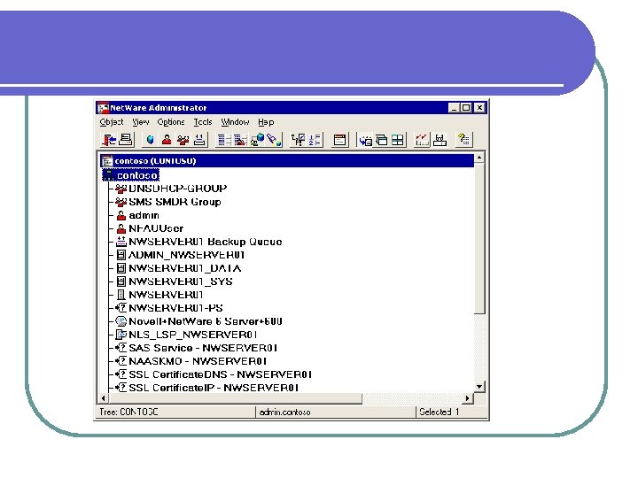l Novell Netware ผรเรมการพฒนา Network OS l มโครงสรางการจดการของ Net. Ware Directory Services (NDS) โดยผใชงานสามารถแลกเปลยนขอมลบ น Server เพอจดการทรพยากรบนเครอขายทงห มด และ Admin สามารถจดการเซรฟเวอรบนเครอขายโดย ลอกอนเพยงครงเดยยว l ใน version 5 ไดพฒนามาใชอนเตอรเฟซแบบ GUI l