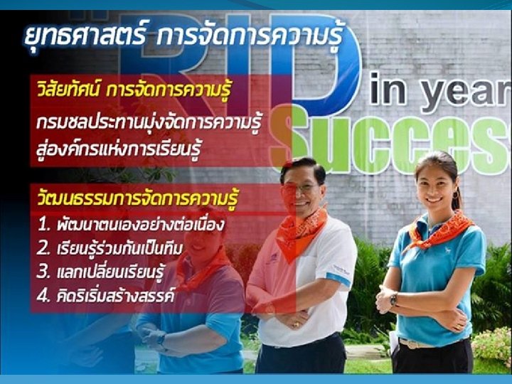 การจดการความร สำนกพฒนาแหลงนำขนาดกลาง q แตงตงทมงานจดการความร - ทมงานจดการความรสำนกฯ - ทมงานเครอขาย (สวน /โครงการ ละ 1 คน) - คณะทำงานรบผดชอบแตละหมวด (ดตามภารกจ ) - คณะงานจดเกบหลกฐาน - ทมงานจดการความรระดบโครงการ - คณะทำงานกลนกรองคมอภายในสำนกฯ q ตงทมงานศนยสารสนเทศ เพอสนบสนนภารกจ และ กจกรรมจดการความรของสำนกฯ q จดทำ web site หลก /web site คลงความร ของสำนกฯและหนวยงานในสงกด ใหพรอม โดยปรบเปลยนรปแบบใหสอดคลองกบเกณฑ kma q ปรบปรงหอง km สำนกฯ และ บอรดนำเสนอ km (ระดบสำนกงานกอสรางดวย )