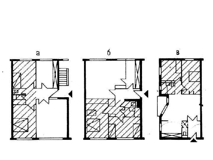 2 - трёхчастное зонирование; 3 - варианты планировок квартир с различным размещением индивидуальной зоны: а - в глубине квартиры; б - по одну сторону от входа; в - в глубине с проходом через общесемейную зону.