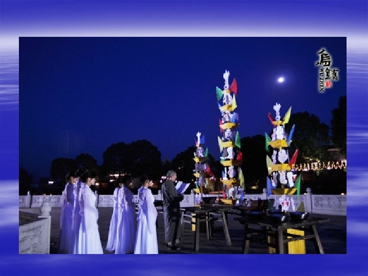 The Story Ø Hou Yi shot 9 suns. Ø Chang’e met Hou Yi and they got married. Ø Hou Yi went to the Kunlun Mountains to look for an elixir of life. Ø House Yi gave the elixir to Chang’e. Ø Chang’e drank the elixir and flew to the moon. Ø Hou Yi sacrificed the moon.