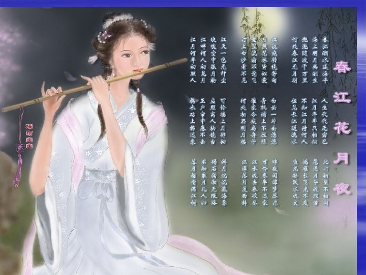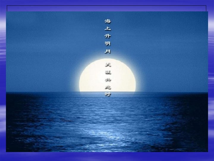 The Poems § 春江潮水连海平,海上明月共潮生。 § In spring, the river rises as high as the sea. And with the river’s rise the moon uprises bright.