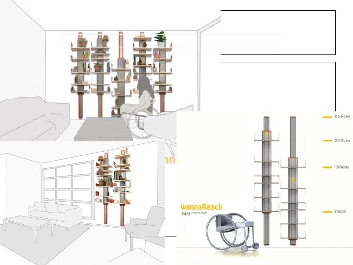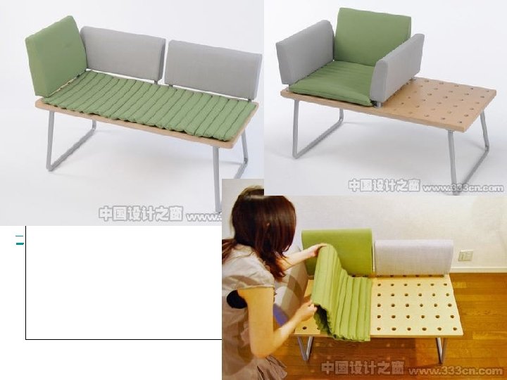 1、针对老年人的设计。 (1)沙发倾斜度越大,起身越不方 便,靠垫过软,使其腰椎得不到有 力支撑,坐垫柔软,使其起身更为 费力,这都是隐性障碍。 (2)在沙发周边加上脚踏、置物板、 杂志搁架等功能附件或角度可调节 等功能。